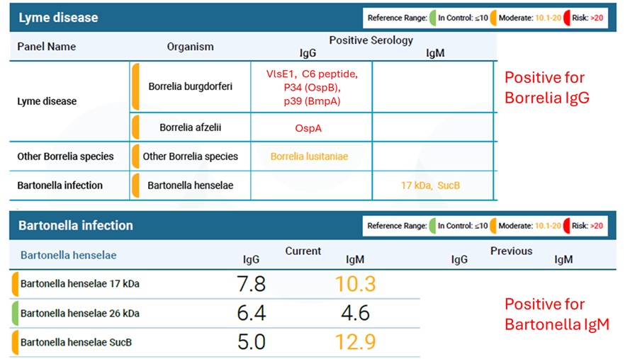 Ciara had Long Covid from an infection 3 years prior. Many of her symptoms had improved with treatment and various interventions but she still suffered from excessive fatigue, PEM, headache and sore throat. She was unable to work full time and while her function had improved from her worst point, she was unable to exercise and she still had to pace carefully. She did not recall a previous tick bite, but had spent a very significant amount of time in the countryside and woods where deer were common. In order to investigate whether she had a reactivation of Lyme Disease, she carried out a tickborne illness and co-infections panel.